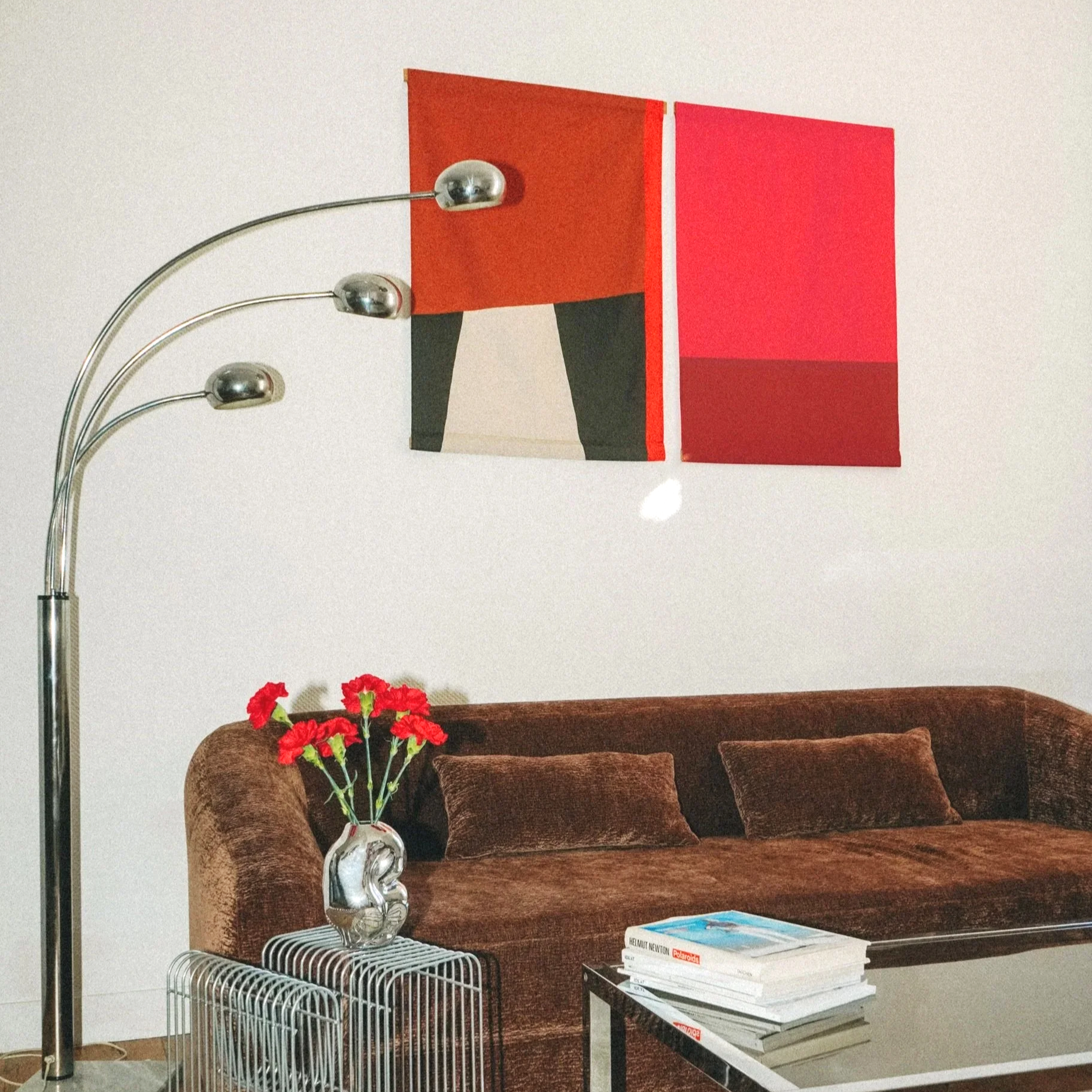 Composition de deux tentures murales “Allure” et "Diptyque" – créations sergé édition en coton, imprimé en France, présentée dans une ambiance salon avec des matières texturées et des objets chromés.